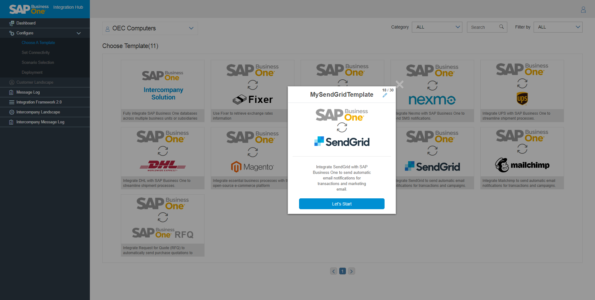 Upon selecting the template, a message “Let’s Start” prompts to start configuring the connectivity settings. Change the template name by clicking the Edit button to edit the template name. Otherwise, it appears as MySendGrid Template.