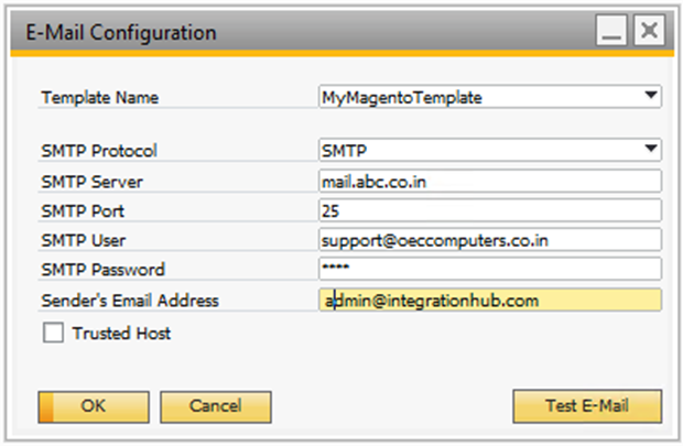 Alternatively, to display the Email Configuration window, choose Administration → Integration Hub → E-Mail Configuration.