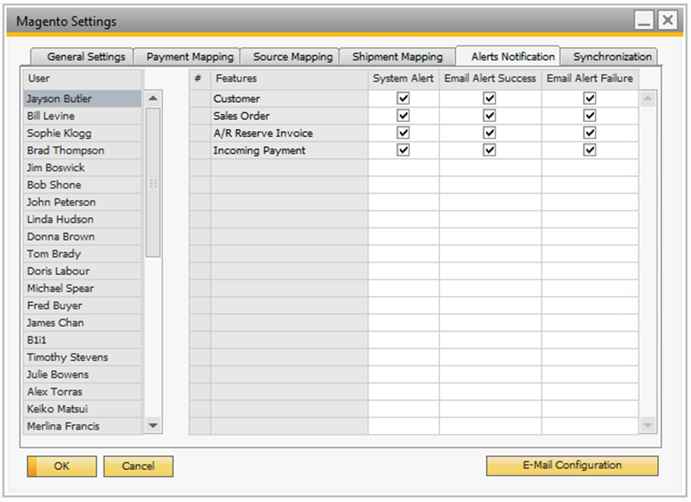 Displays the list of users in SAP Business One. Choose a user for setting up the alert notification authorizations. This field is read only.