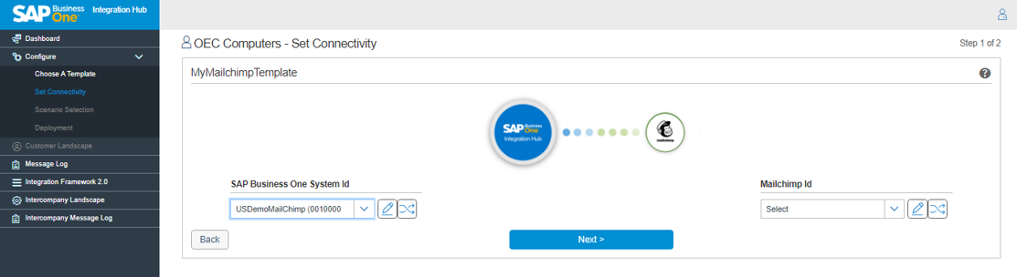 - Choose the SAP Business One SLD to provide the connection between SAP Business One System Id and Mailchimp Id.