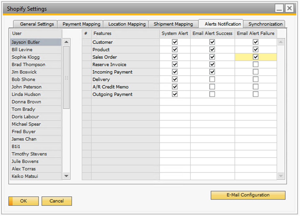 Displays the list of users in SAP Business One. Choose a user for whom to set up the alert notification authorizations.