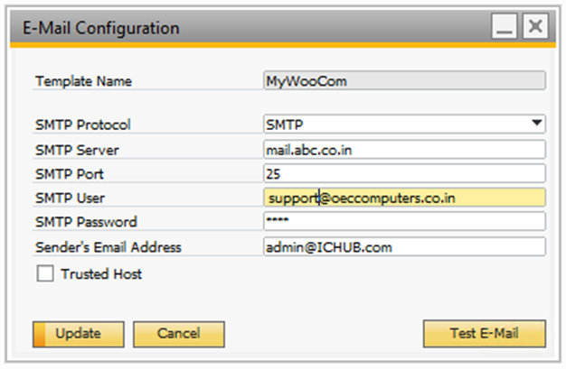 Alternatively, to display the Email Configuration window, choose Administration → Integration Hub → E-Mail Configuration.