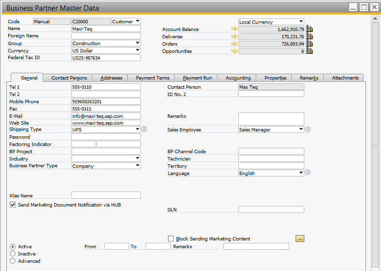 In Business Partner Master Data window, a field Send Marketing Document Notification via HUB is available in the General tab.