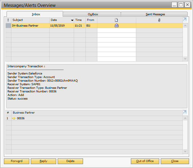Once the customer data is synchronized, Message /Alert Overview Inbox displays the transaction information in SAP Business One. The following information is displayed on the screen: