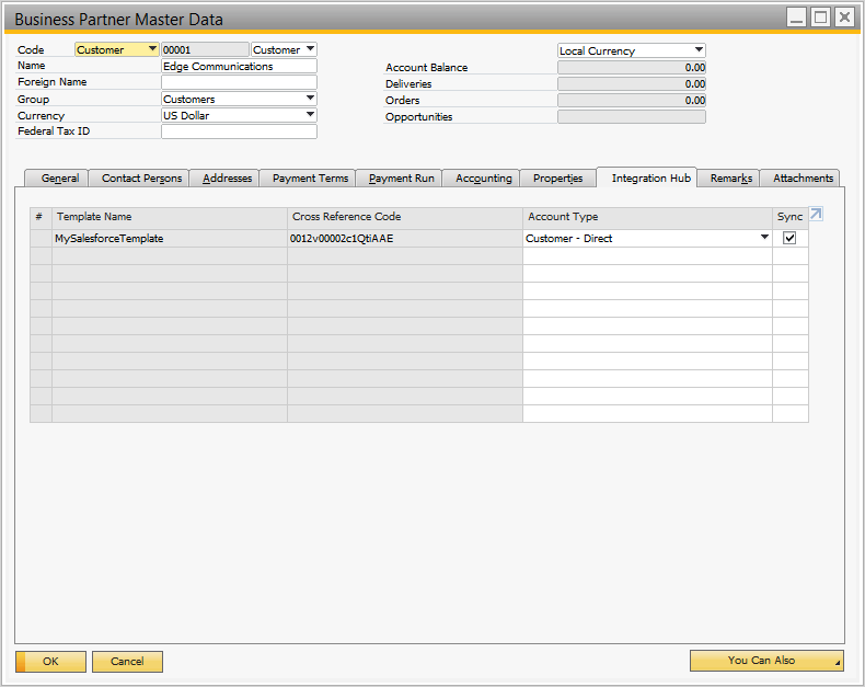When the Account is integrated from Salesforce to SAP Business One, the details such as Salesforce Account ID is updated in Cross Reference Code in SAP Business One. Salesforce Account Type is updated in Account Type in SAP Business One.