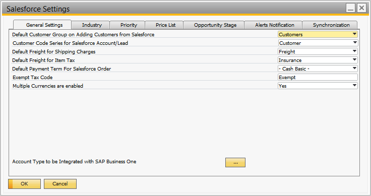 Select the Customer Group, the customer will be created in SAP Business One based on the customer group selected. The selected Customer Group is used to add customers from Salesforce. |