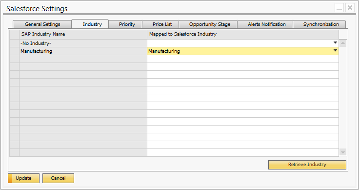 Configure the Industry in the Industry tab in Salesforce Settings window.