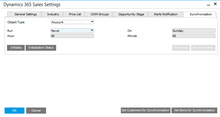 Once the Dynamics 365 Sales feature is enabled in SAP Business One, it is mandatory to initialize the objects to be integrated between SAP Business One and Dynamics 365 Sales. The objects include Account, Contact, Product and Lead.