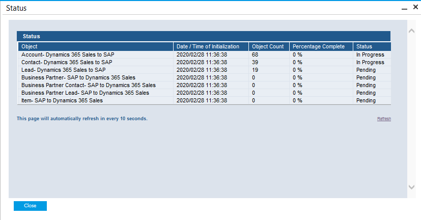 Click on the Initialization Status button to view the initialized status of the data replication between Dynamics 365 Sales and SAP Business One.