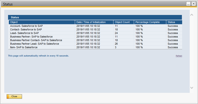 Click on the Initialization Status button to view the initialized status of the data replication between Salesforce and SAP Business One.
