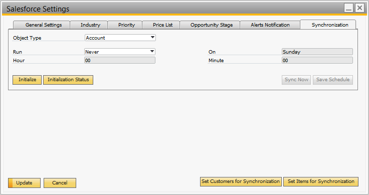 Once the Salesforce feature is enabled in SAP Business One, it is mandatory to initialize the objects to be integrated between SAP Business One and Salesforce. The objects include Account, Contact, Product and Lead.