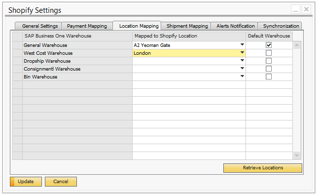 Select one SAP Business One warehouse as default to any one Shopify location.