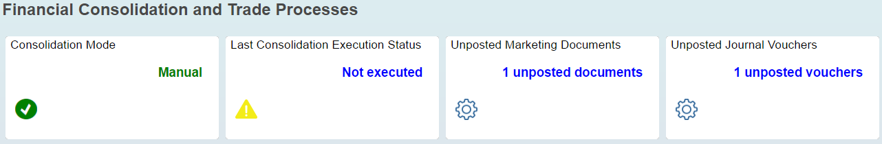 This tile displays whether consolidation mode is manual or automatic, clicking on this tile will display the consolidation mode of each branch company
