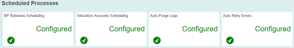 This tile displays the allocation account scheduling status whether it is configured or not for automatic synchronization of allocation accounts across branch companies, clicking on this tile will open the configuration screen for allocation account scheduling. Auto Purge Log: