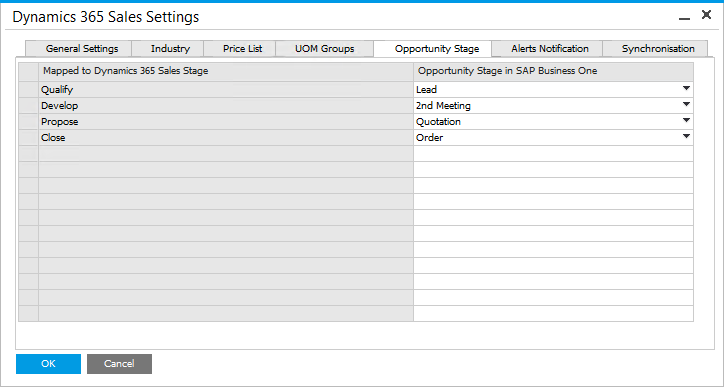 - Configure the Opportunity Stage in the Opportunity Stage tab in Dynamics 365 Sales Settings window. All Dynamic 365 Sales Stages should be mapped to Opportunity Stages in SAP Business One.