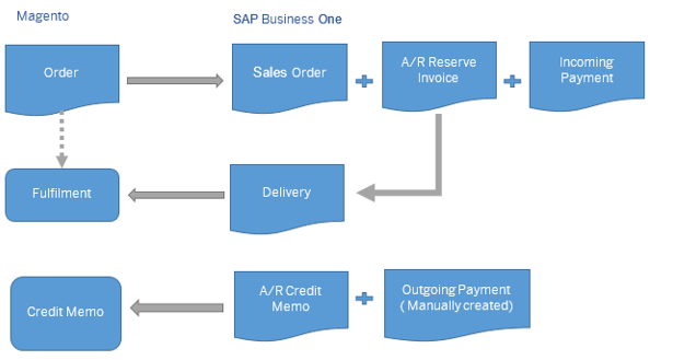 The following illustration shows the data flow between Magento and SAP Business One based for Orders with Payment: