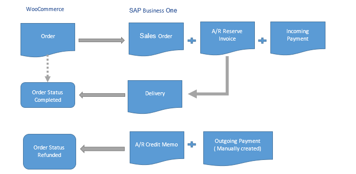 The Application handles these scenarios differently as per payment/order types. For instance, all WooCommerce orders for which payment is made at the time of placing the order is handled in SAP Business One by posting a Sales Order, corresponding A/R Reserve Invoice and Incoming Payment for that A/R Reserve Invoice.