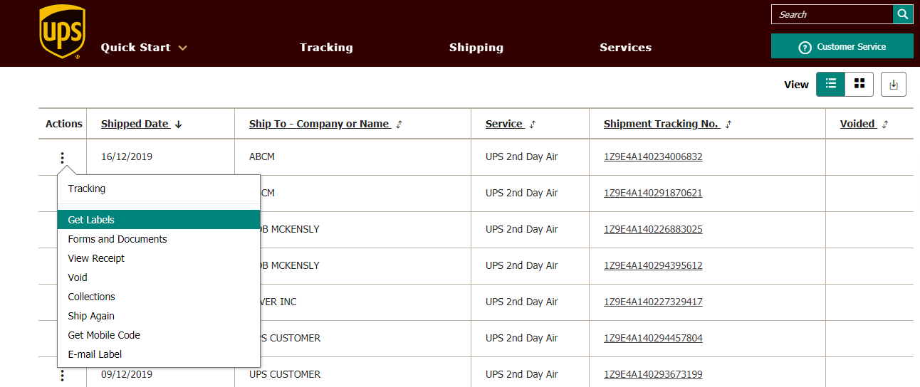 The URL for all shipments created for UPS account is - https://www.ups.com/ship/history?loc=en_DE