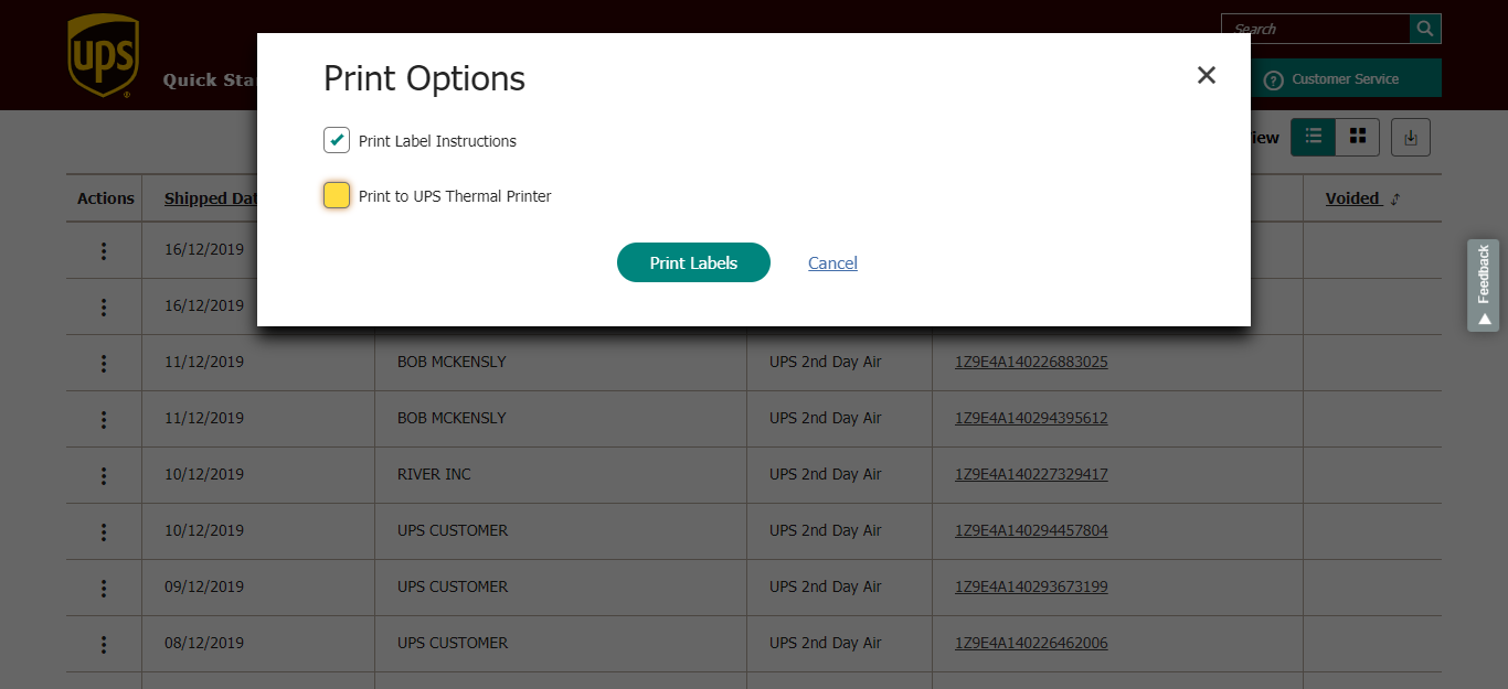 Once shipment tracking number is generated, the user can create the labels from the UPS site.