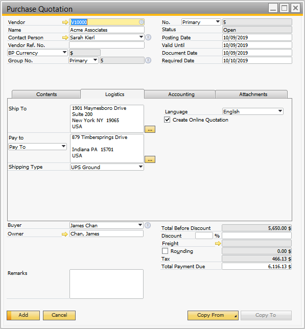 In Logistics tab of the Purchase Quotation, select the flag for Create Online Quotations. To open the Purchase Quotation window, go to Main Menu → Purchasing A/P → Purchase Quotation