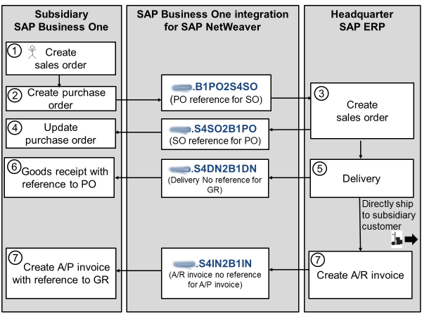- The headquarters sends back information from the sales order to update the subsidiary purchase order. This update includes the reference document number, products, quantities, delivery date, and pricing.