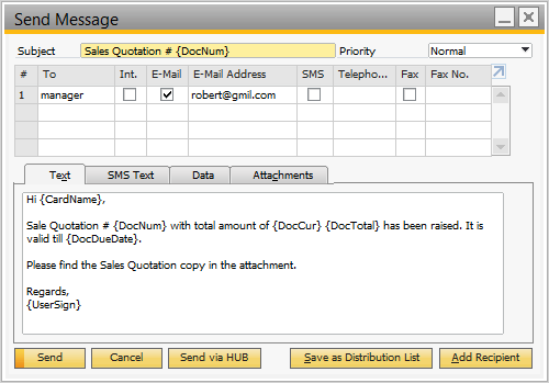 In the Send Message window, a Send via HUB button is available. To open the Send Message window, open any marketing document and in the toolbar choose the SAP Business One Mailer