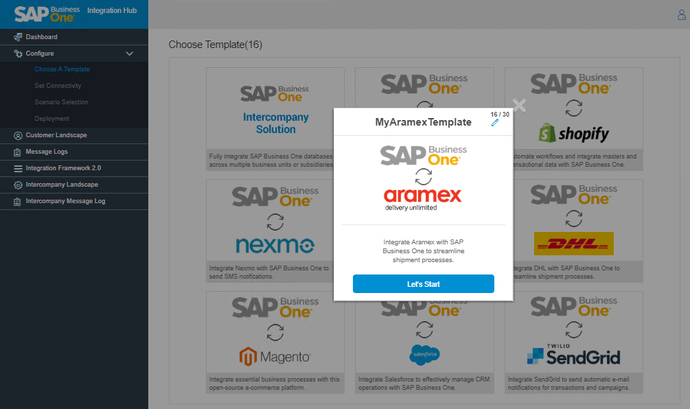 Upon selecting the template, a message “Let’s Start” prompts to start configuring the connectivity settings. Change the template name by clicking the Edit button to edit the template name. Otherwise it appears as MyAramexTemplate.