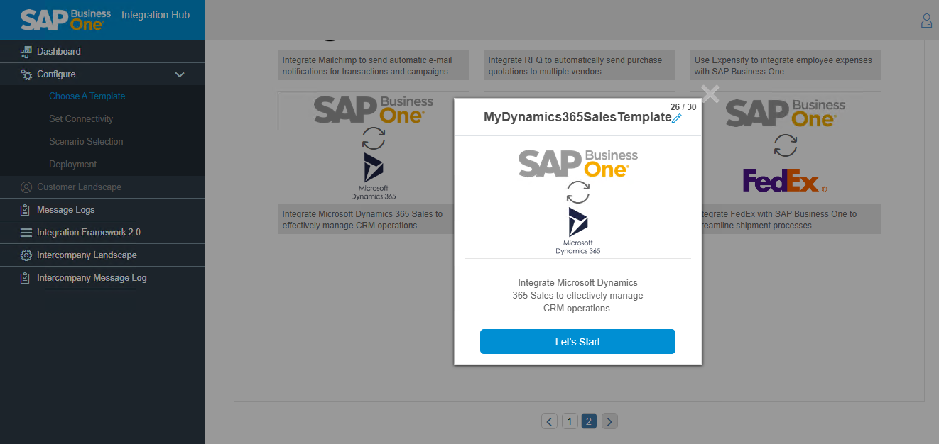 Upon selecting the template, a message “Let’s Start” prompts to start configuring the connectivity settings. Change the template name by clicking the Edit button to edit the template name. Otherwise it appears as MyDynamicCRMTemplate.