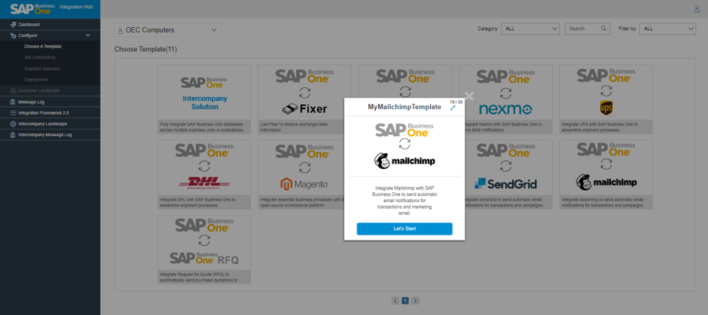 - Upon selecting the template, a message “Let’s Start” prompts to start configuring the connectivity settings. Change the template name by clicking the Edit button to edit the template name. Otherwise, it appears as MyMailchimp Template.