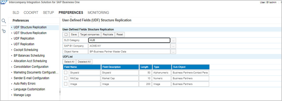 All the UDFs from selected SAP B1 Company are displayed. The UDF with the Validation as Advanced is not supported for replication.