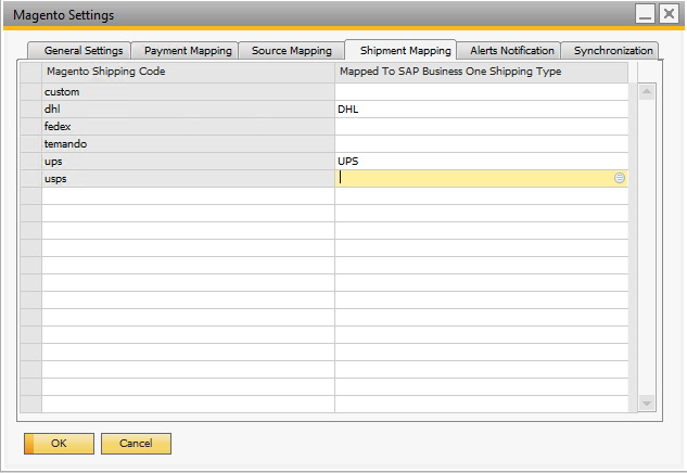 The Shipping code which are available in Magento need to be mapped with the Shipping Types of SAP Business One. This mapping is used to integrate the shipping code in the transactions.