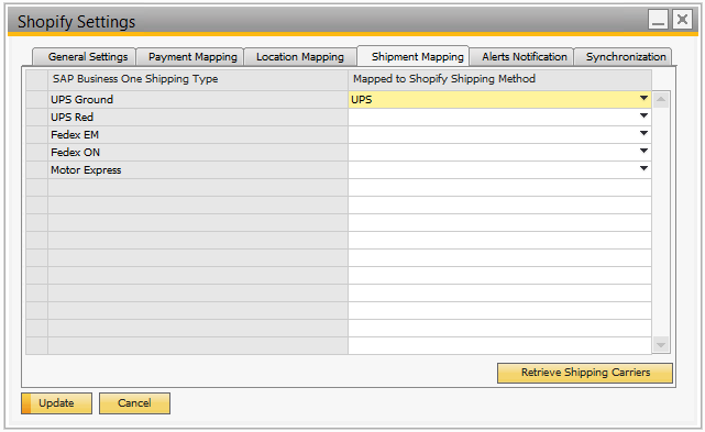 The shipping method mapped is used for updating the tracking and shipment details in Shopify and SAP Business One.