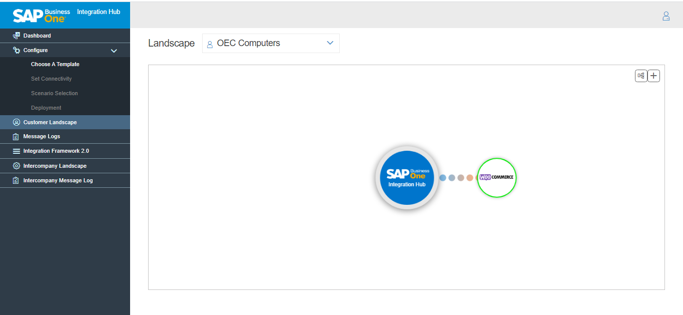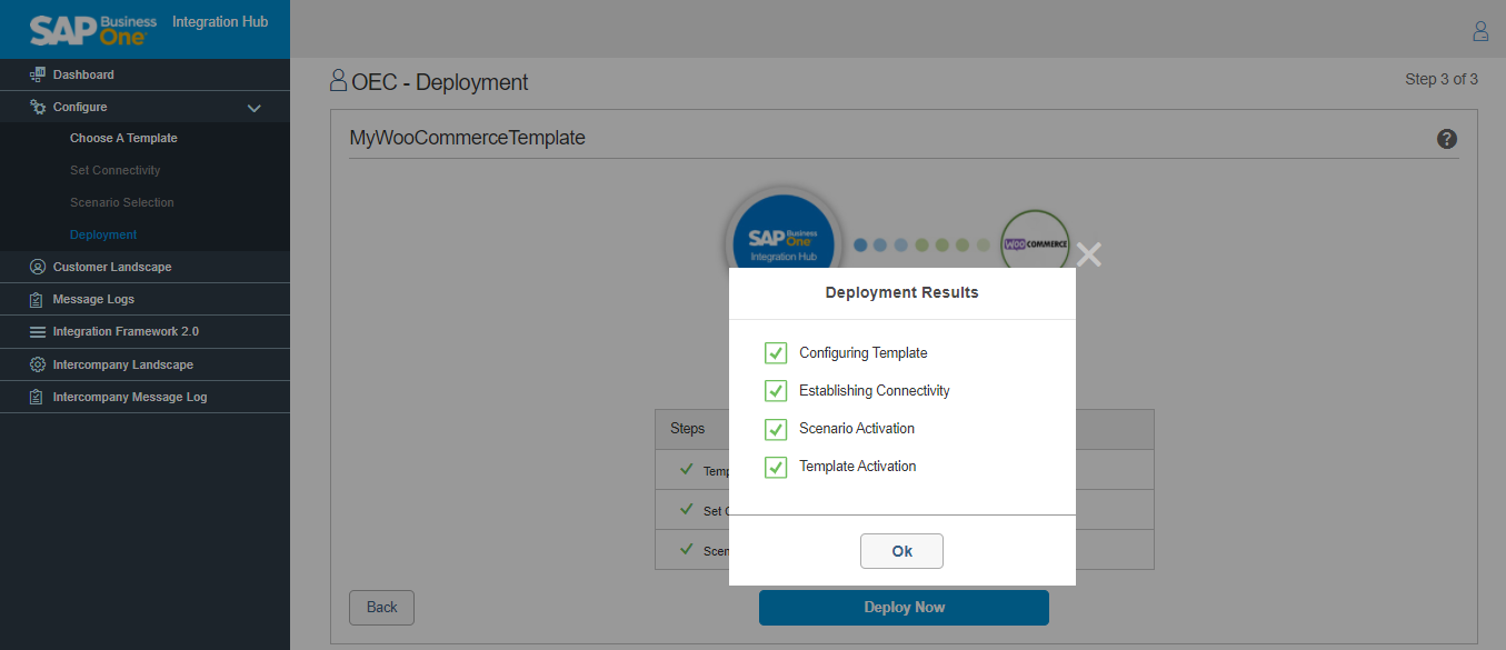 - Once all stages are checked, click the OK button on the Deployment Results window to proceed. The successful deployment of solution in Integration Hub results in enabling the features in SAP Business One. Customer Landscape displays connection of SAP Business One to WooCommerce.