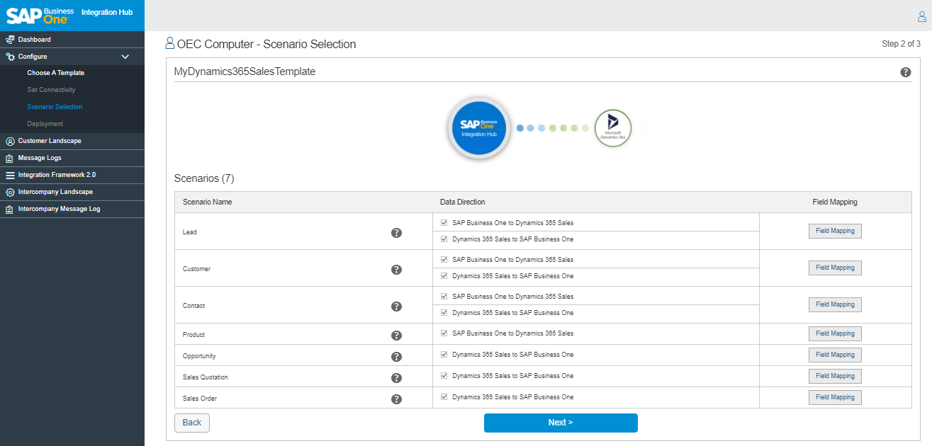 - The Scenario Selection displays the Scenario, Data Direction, and Field Mapping. By Default, the Data Direction for Lead is not selected. You can select the data direction as per your company policies.