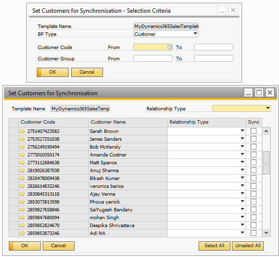 - Set Customers for Synchronization window opens, select the Customer Codes and BP Name to synchronize. It is mandatory to select Account Type for Customers for synchronization.