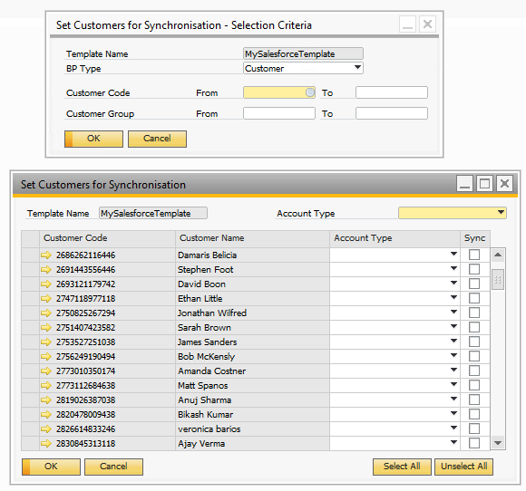 - Set Customers for Synchronization window opens, select the Customer Codes and BP Name to synchronize. It is mandatory to select Account Type for Customers for synchronization.