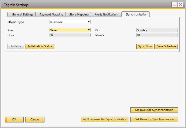 The system enables a user to configure automatic integrations between SAP Business One and Tagrain at a frequency (either daily or weekly) and at specific intervals. The synchronization runs based on the schedule that is set for the object.
