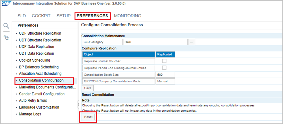 Go to Intercompany Administration Console → Preferences → Consolidation Configuration and reset the consolidation. Please refer to the screenshot provided for guidance.