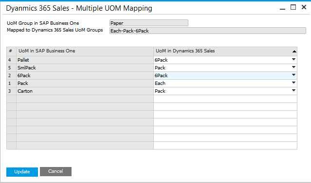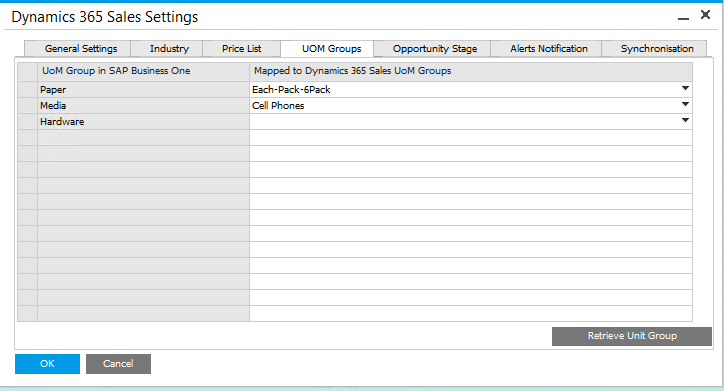 Configure Unit of Measure (UOM) in the UOM Groups Tab in Dynamics 365 Sales Settings window. The Unit of Measure subgroups in SAP Business One can have one to one mapping with multiple sub UOM defined in Dynamics 365 Sales.