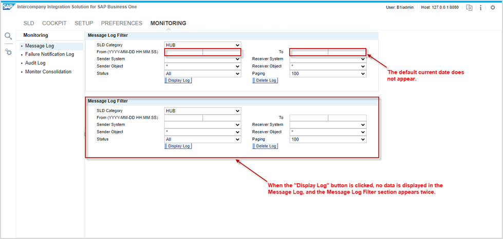 The operational issue in intercompany monitoring. When clicking on the display log button in the message log, it doesn't show the transaction logs, and the default current date does not appear.