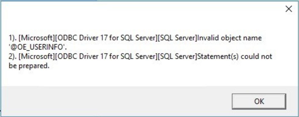 1). [Microsoft][ODBC Driver 17 for SQL Server][SQL Server]Invalid object name '@OE_USERINFO'