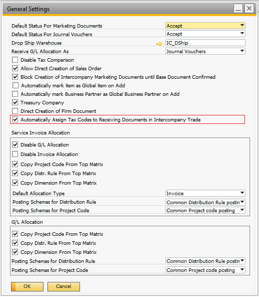 1. A checkbox Automatically Assign Tax Codes to Receiving Documents in Intercompany Trade is available on General Settings.