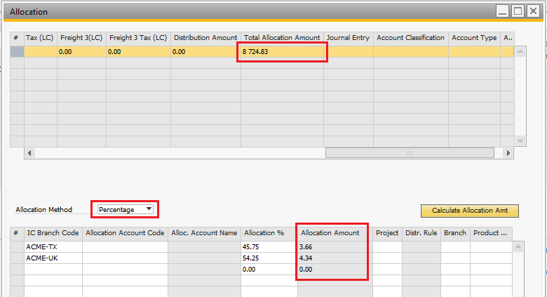 The calculated allocation amount is incorrect if the "Thousands Separator" is set to "Space" in the Display tab in General Settings of SAP Business One on the following allocation screens: