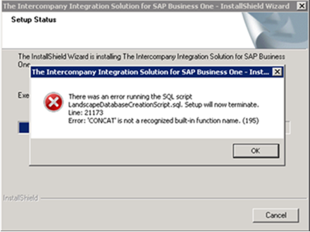 While you are installing the Intercompany Solution 2.0 add-on on MS SQL Server 2008 R2, the following error message may appear and the installation fails: