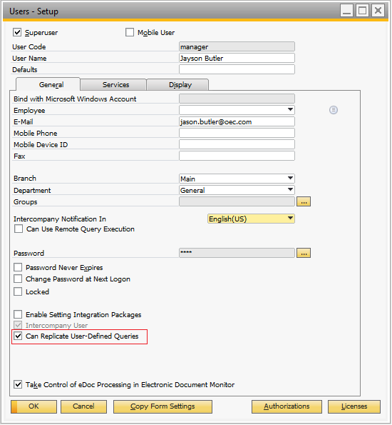 This feature is available only for a user having the "Can Replicated User Defined Query" checkbox is selected in the Users – setup window.