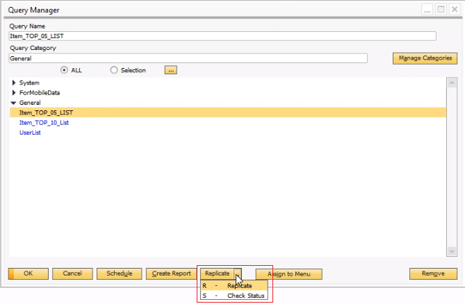 To view the query replication status, select the "Check Status" from the dropdown on Replicate button on the Query Manager window. See the screenshot above.