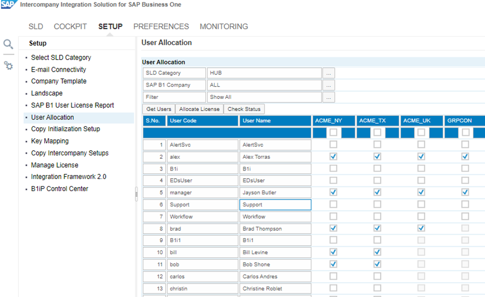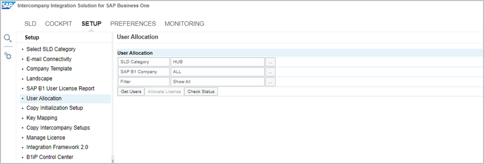 • You should always have valid intercompany license count as SAP Business One license count, otherwise user list will not be displayed in the User Allocation window.