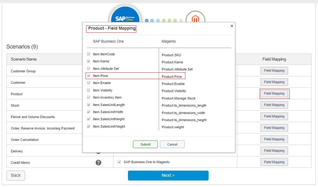 Sometimes the user would like to have separate item prices in Magento and SAP Business One and does not want to replicate the item prices between the applications, so an option is now provided to deselect the item price property in item master synchronization.