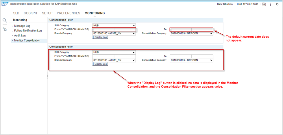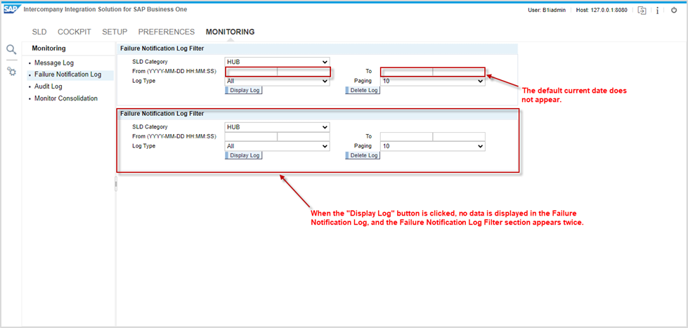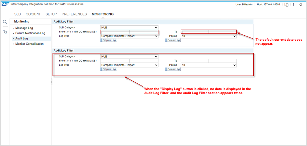 The operational issue in intercompany monitoring. When clicking on the display log button in the Audit Log, it doesn't show the transaction logs. The default current date does not appear.