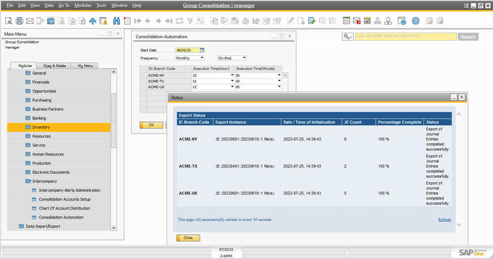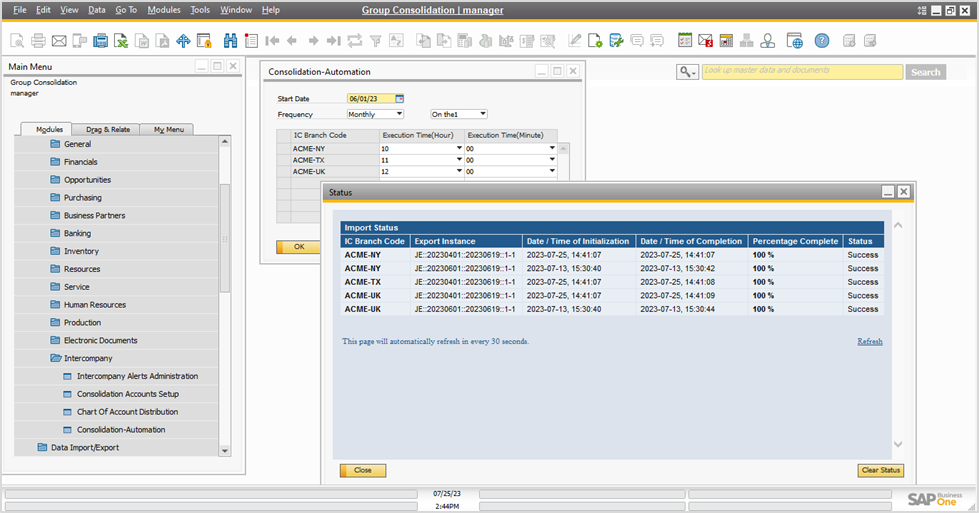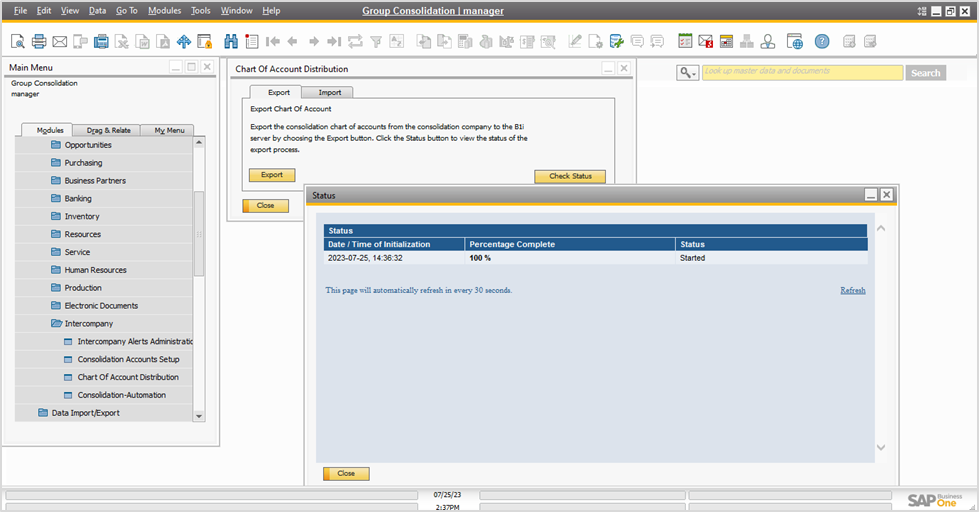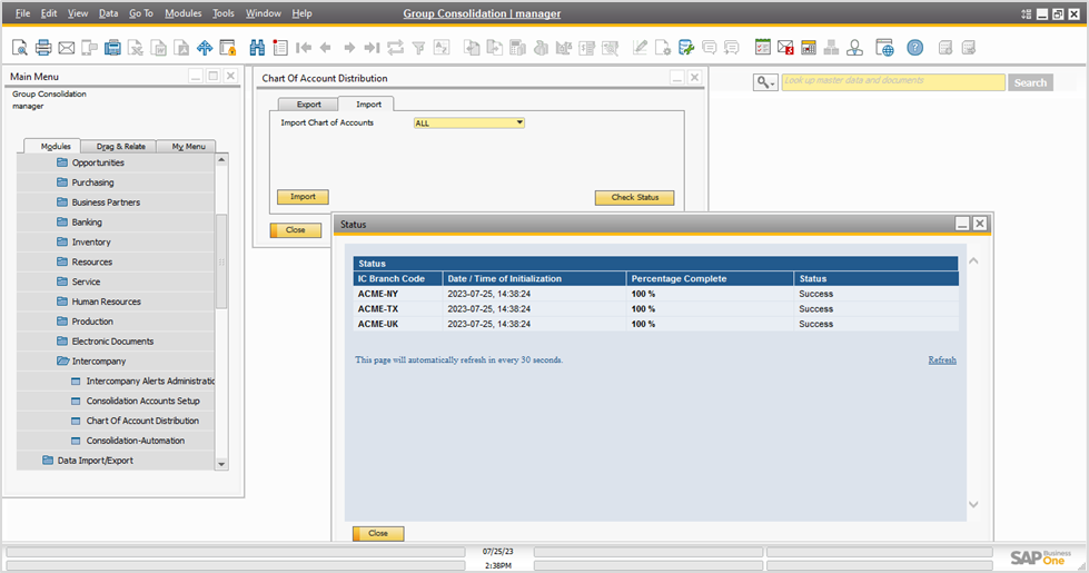 After fixing the SAP B1if issue, screenshots of the Intercompany export and import process status are given for reference: